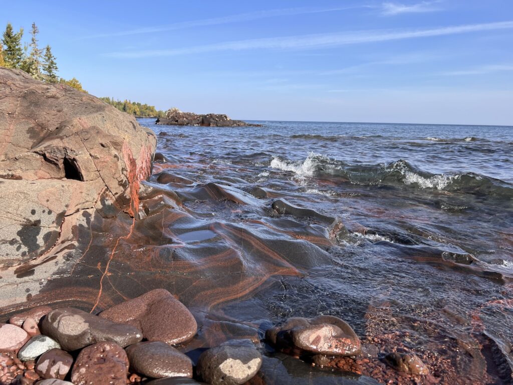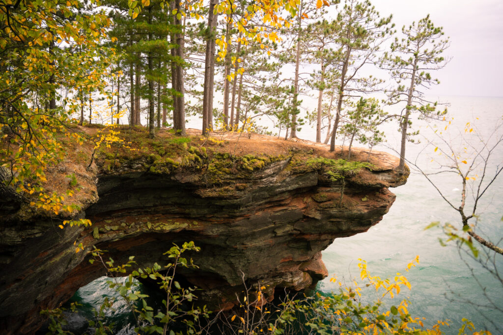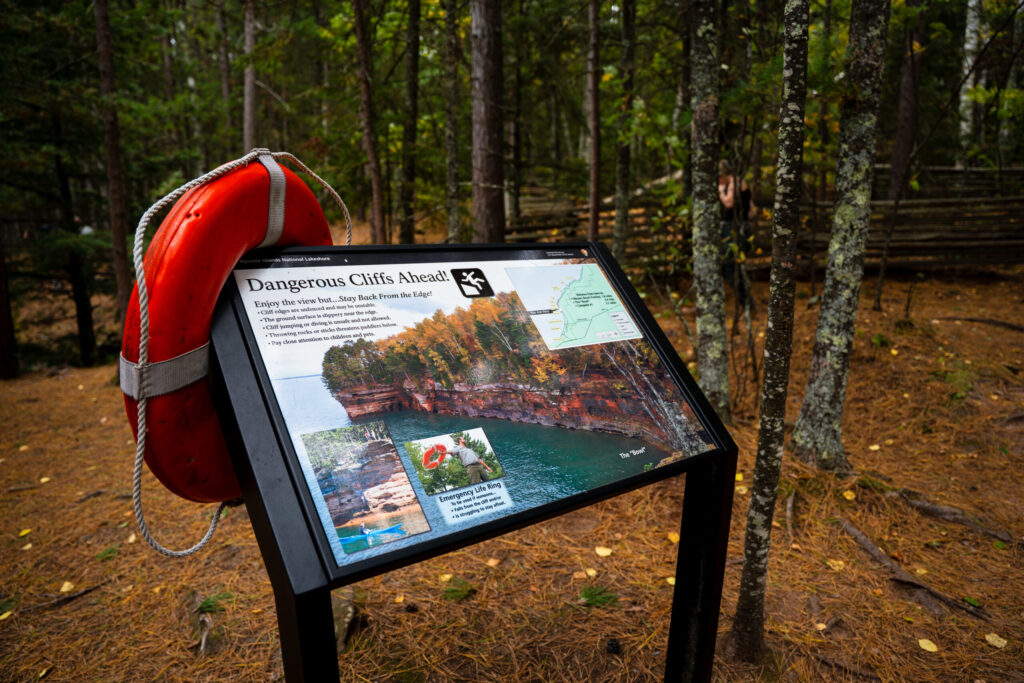 We took the Lakeshore Trailhead roughly 2 miles in to see the rock formations along Lake Superior at the Apostle Islands National Lakeshore. The wind was blowing around 20 mph, but it was blowing away from shore so the waves weren’t massive, but there was still “Clapping” that sounded like trees snapping in the forest as waves crashed into the rocks. The edges were unprotected and extremely steep.